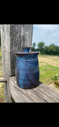 Stash jar with lid and handmade wooden spoon clay pottery stoneware