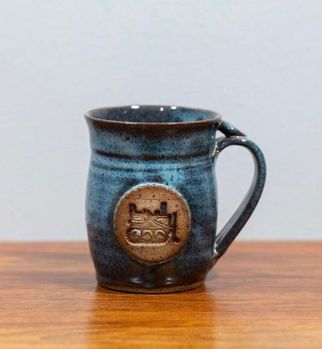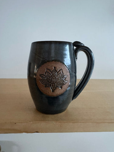 • 14 ounce coffee tea mug with thumb rest stoneware clay stamped flowers