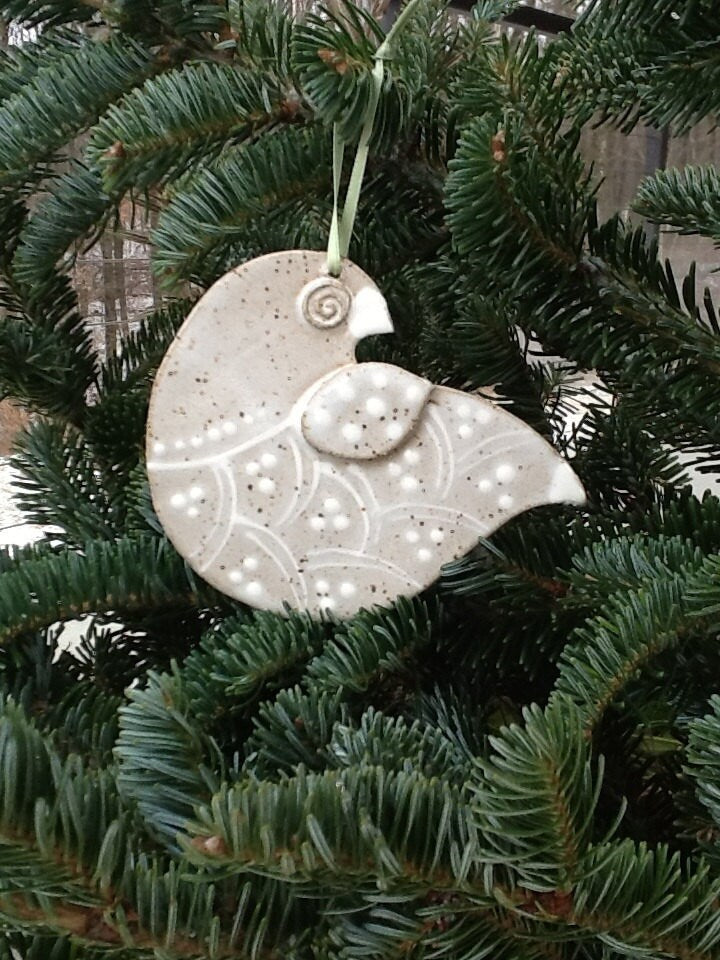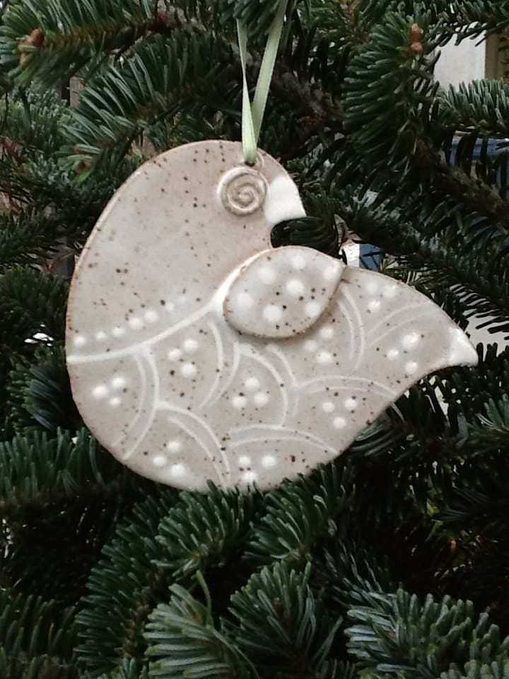 This bird is has a pretty pattern of white slip beneath white glaze. Fired strong, these handmade pottery ornaments are definately unique! I have a flight of these birds on my bathroom wall. They were originally made for the tree, but I have seen them in kitchens, on porches, tied to packages, and on front doors too! Approx. 3x5inches