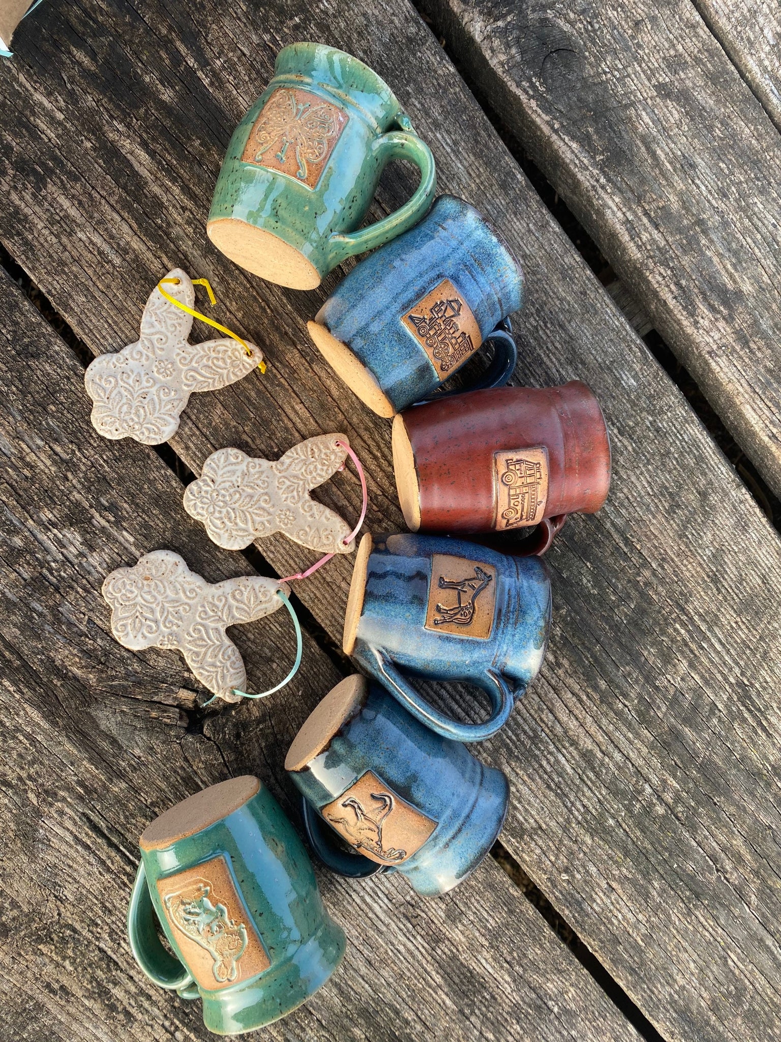 6-8 ounce kids mug in beautiful blue with train stamp on front. Food and dishwasher safe. Thumb rest. Perfect for practicing hands. Wonderful Easter gift or stocking stuffer.