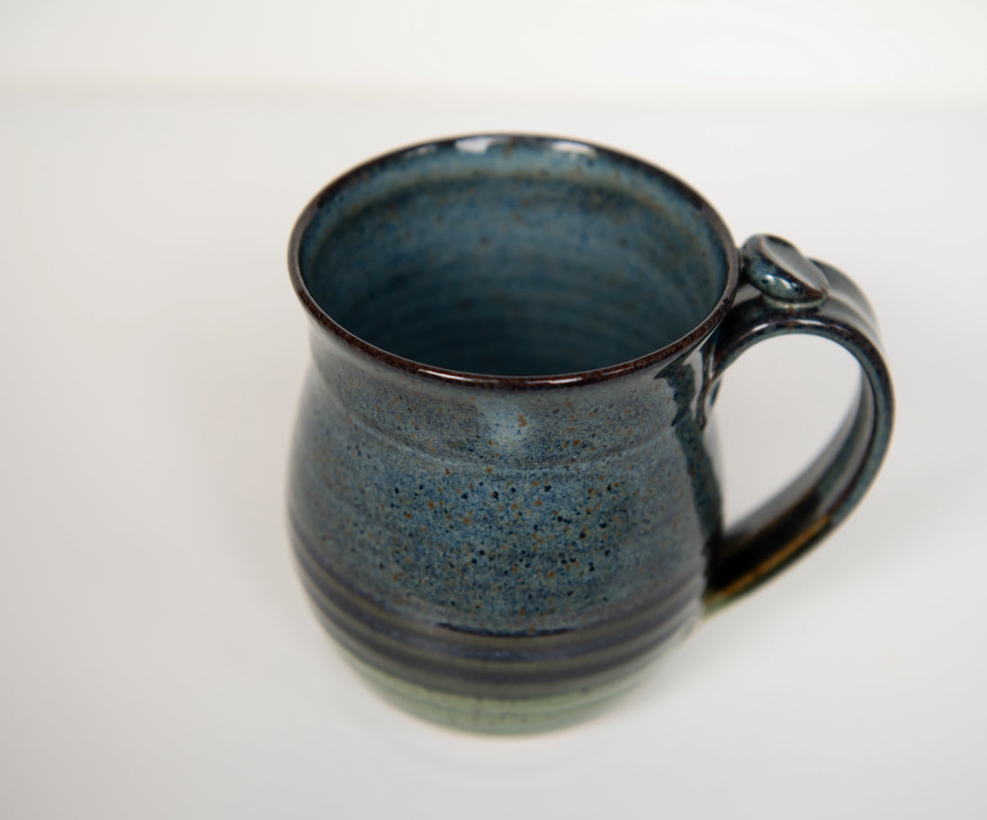 14-16 ounces bulbous shaped coffee tea mug. Simple, traditional, elegant. Blue and Earth green. Thumb rest. This is the mug shape and sized most frequently used in our house, from the littlest cousin to the coffee loving French grandmother! Food safe. Microwave and dishwasher safe. Each mug varies slightly in size but are approximately 4 inches tall, the base is just over 2 inches and the top opening is just over 3 1/2 inches.