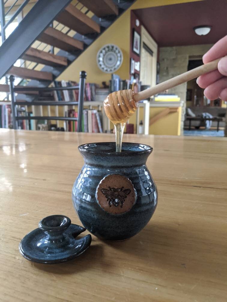 Lidded honey jar with honeycomb spoon. Approximately 4.5 inches tall. Food safe. Dishwasher safe.