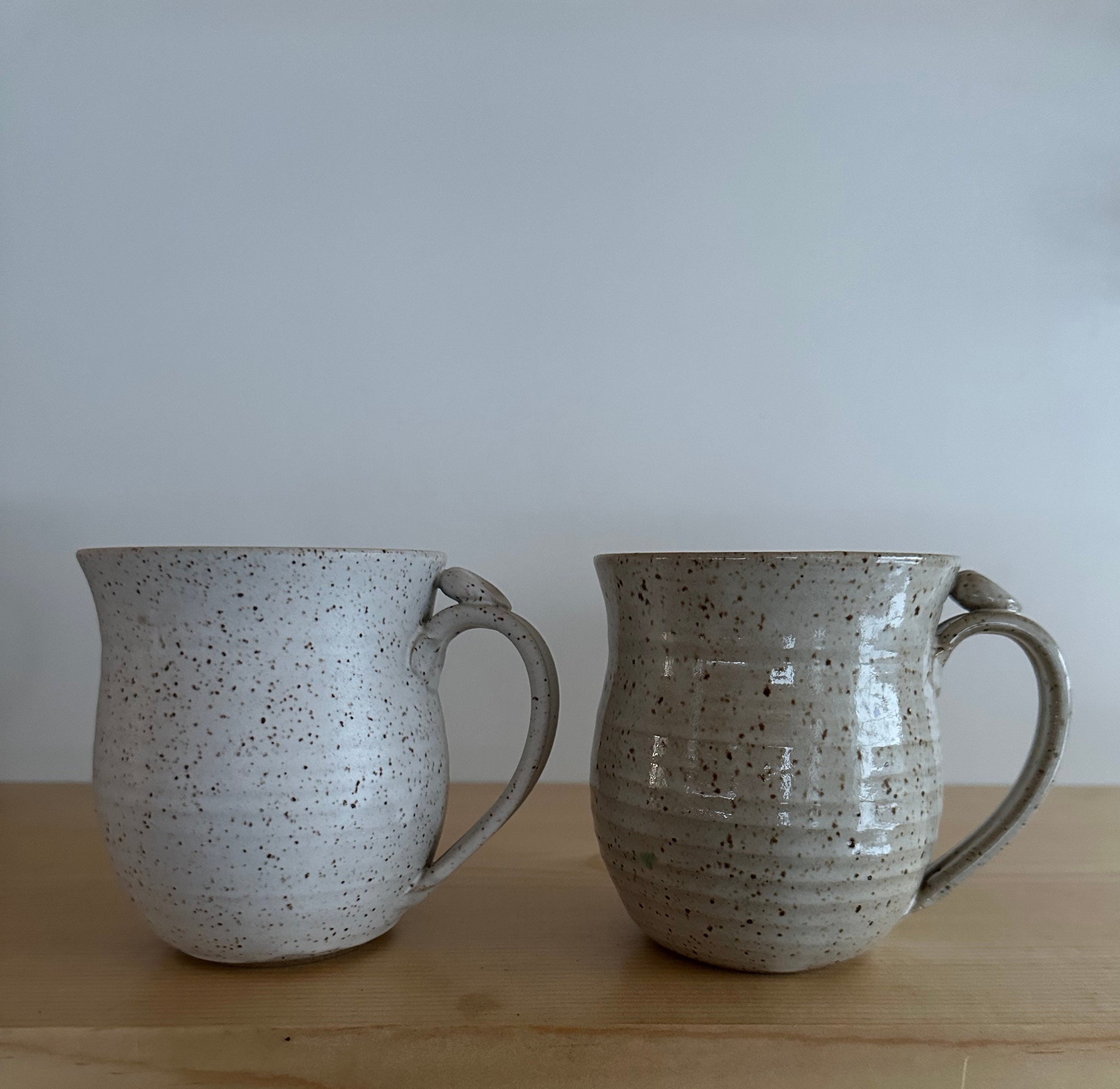 This listing is for one 14 ounce matte white coffee mug with thumb rest. Speckled clay adds some depth to this mug! I've also added a few extra photos here so you can see the matte glaze beside my traditional gloss white glaze! Food, safe, dishwasher, safe, no microwave. Move between hot and cold temperatures slowly.