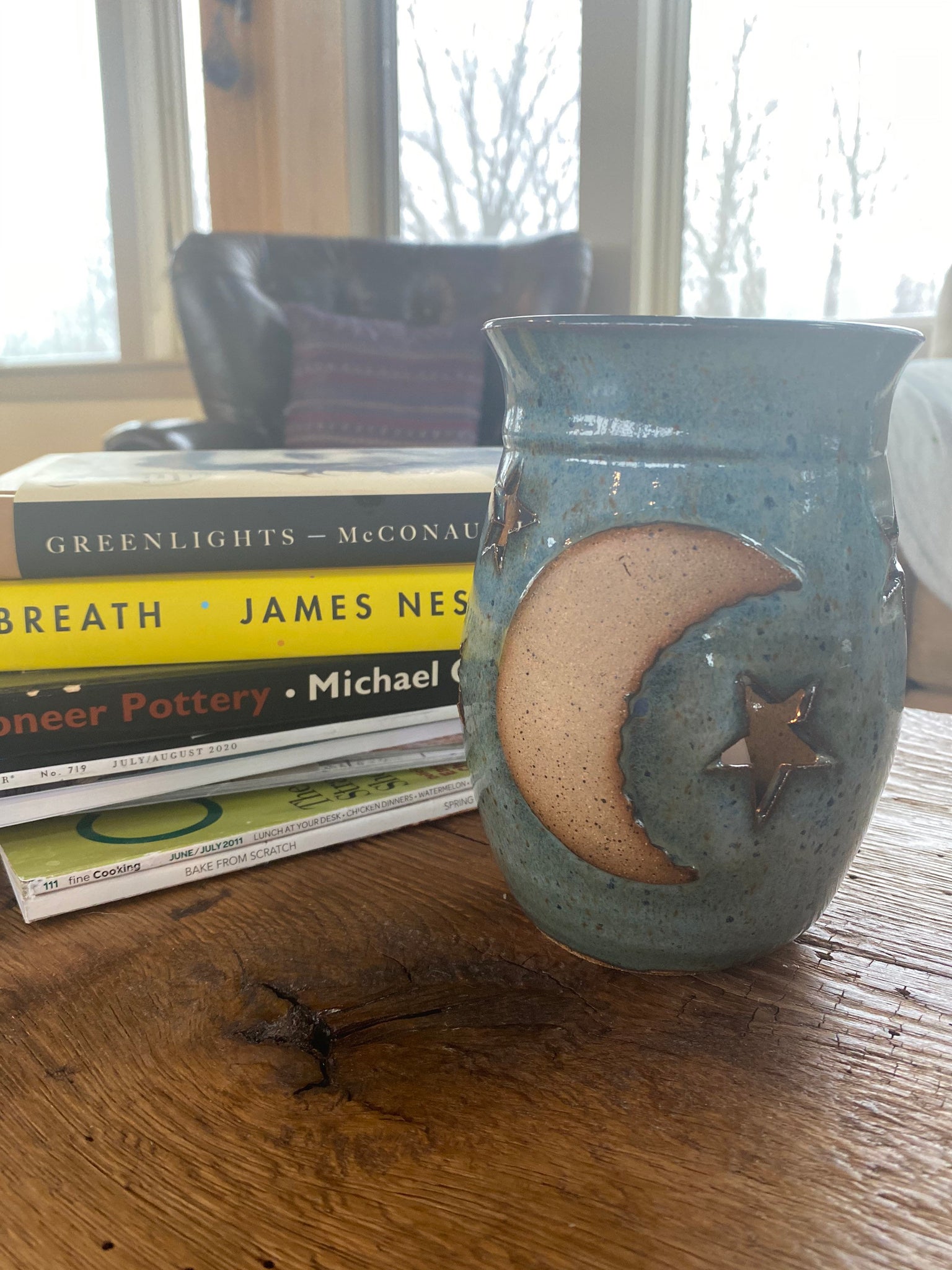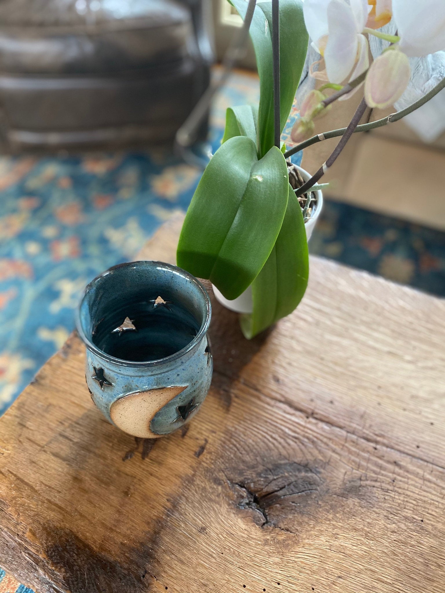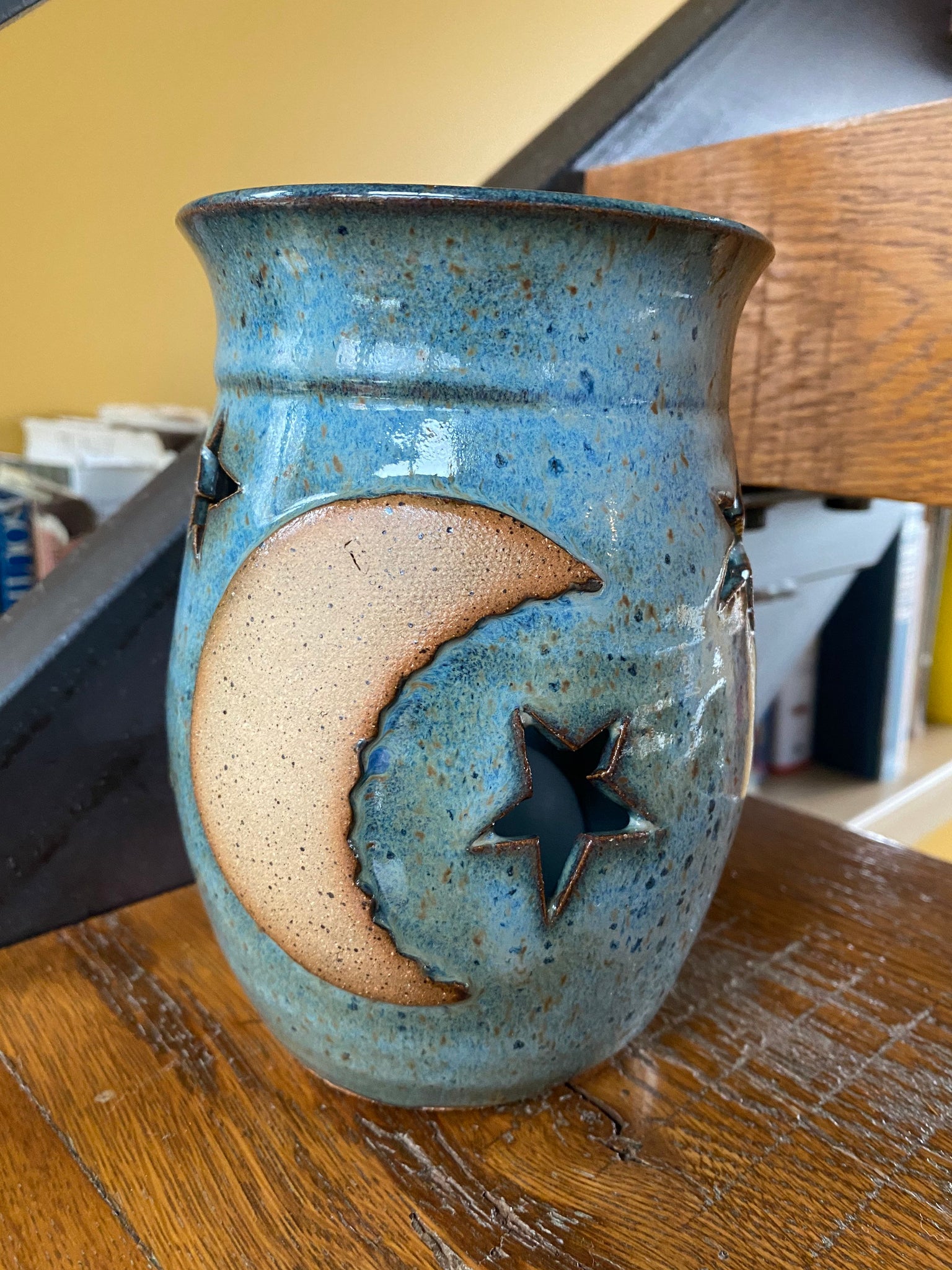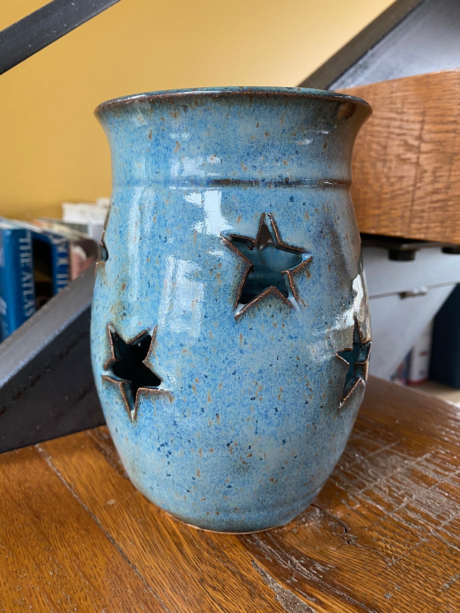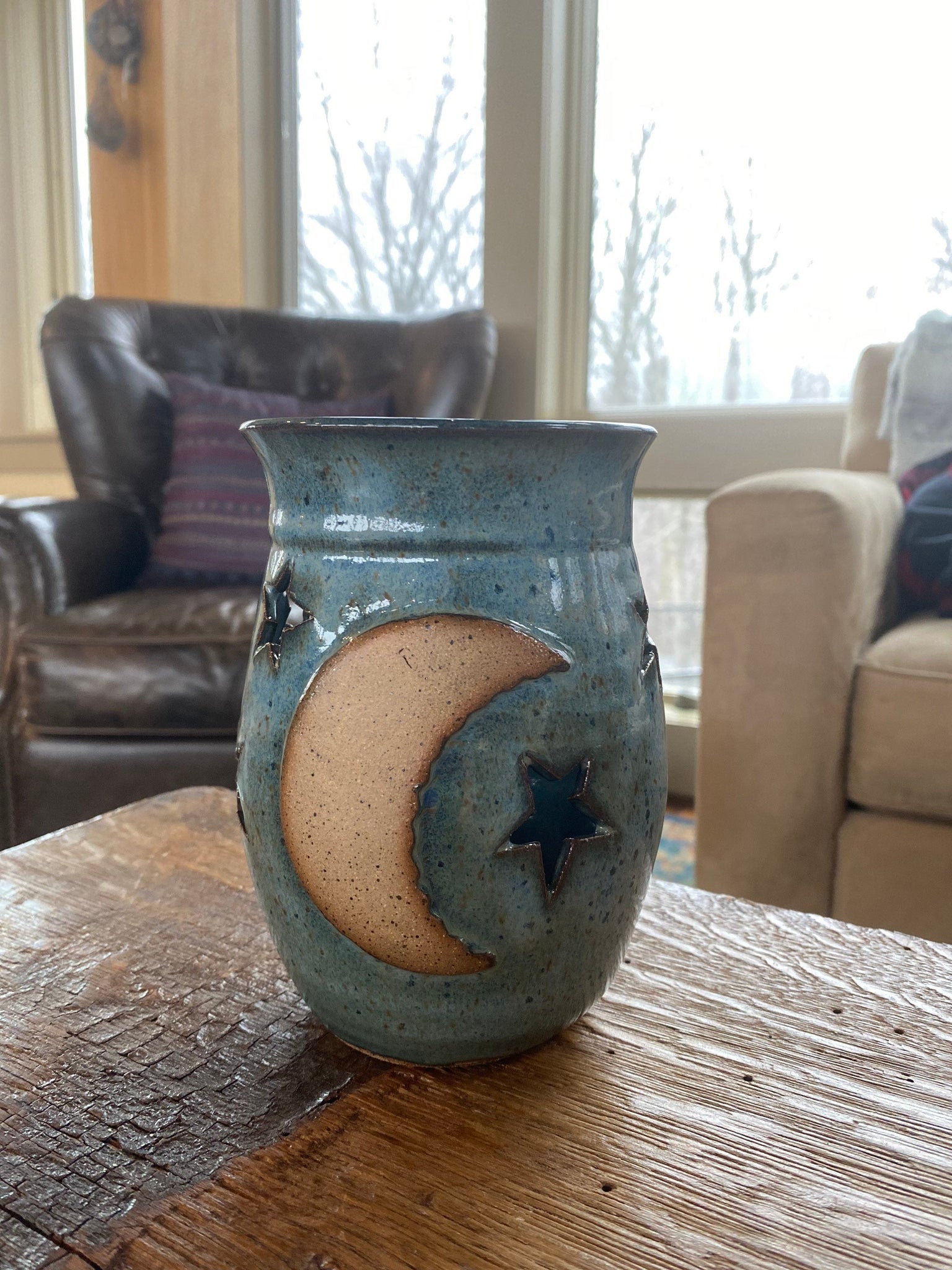 This is a once in a blue moon cut out candle holder. Place a votive inside and beautiful light will shine from the cut out stars! Approximately 8 inches tall.