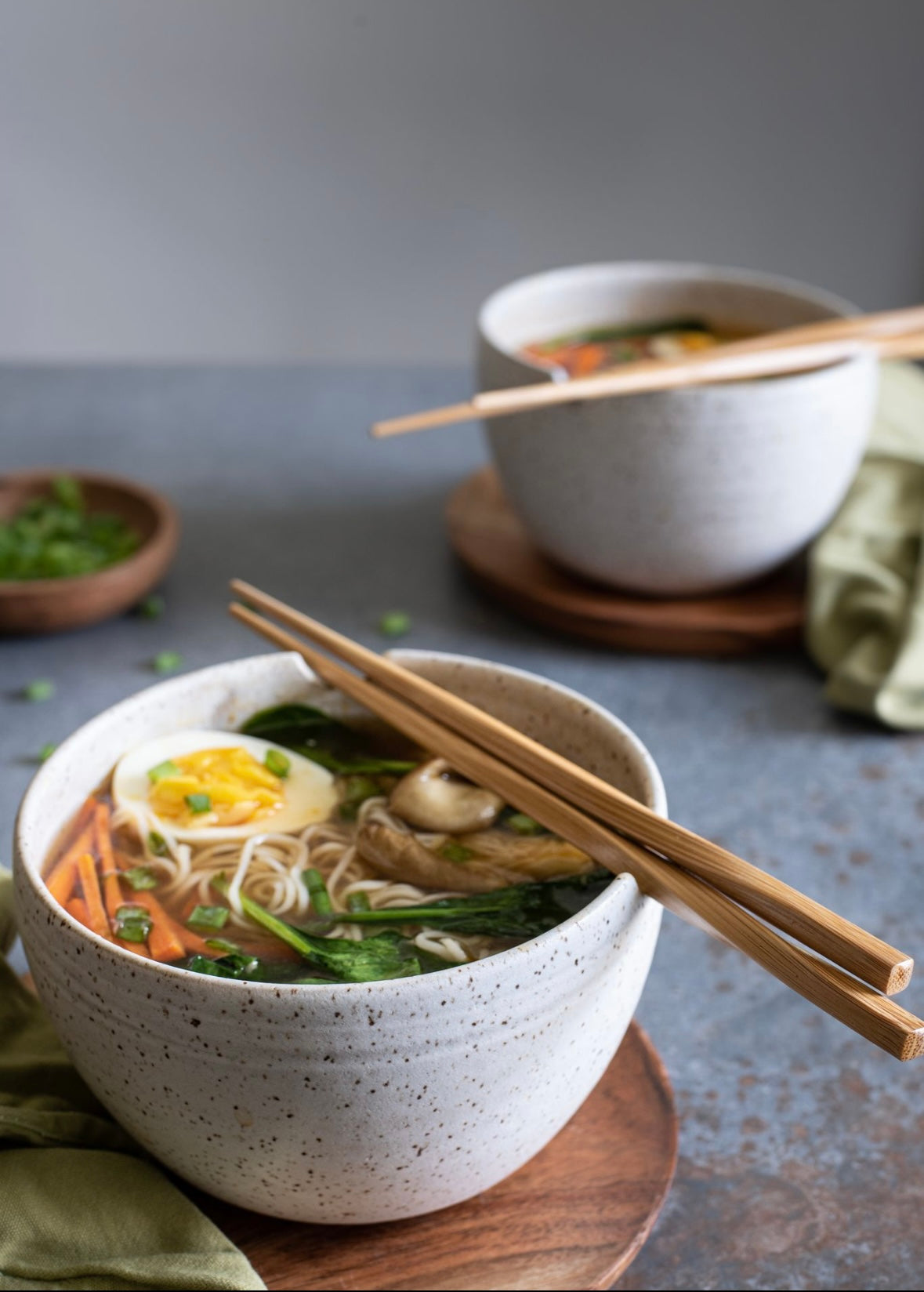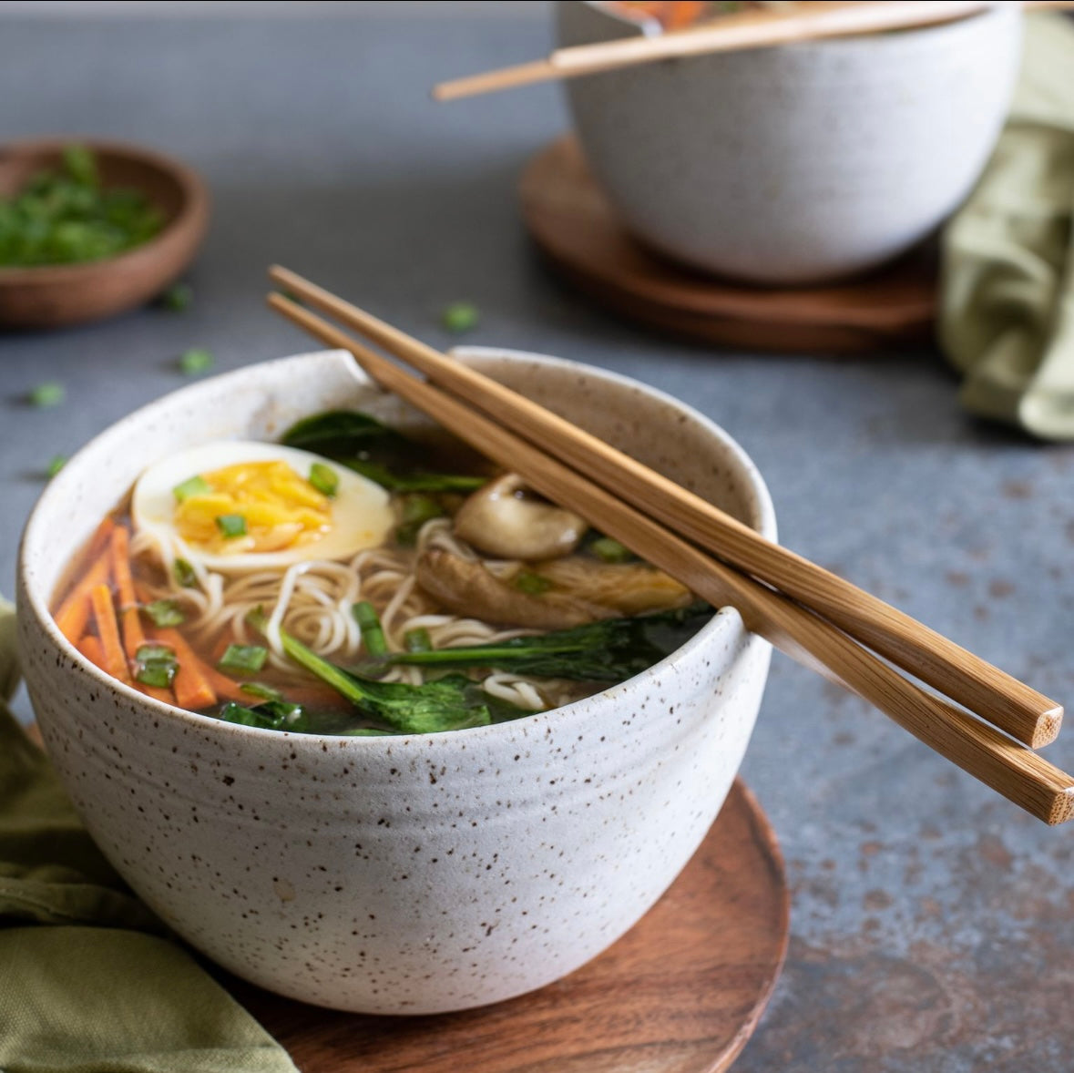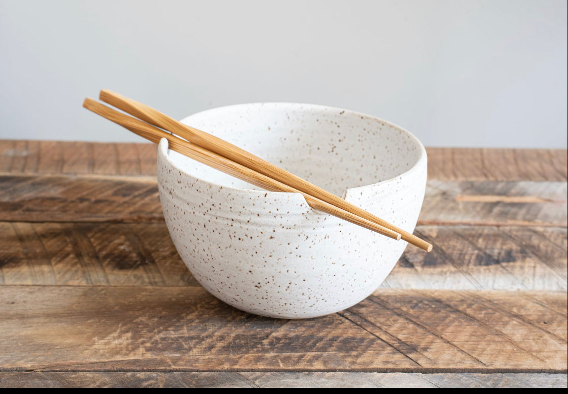 This is a generous 2.5+ cup bowl for your favorite hearty noodle, ramen, pasta or rice meals. Food safe. Dishwasher safe. Chopsticks included. Speckled white matte glaze. Stoneware clay. Hand thrown pottery. The perfect serving bowl for special meals! .