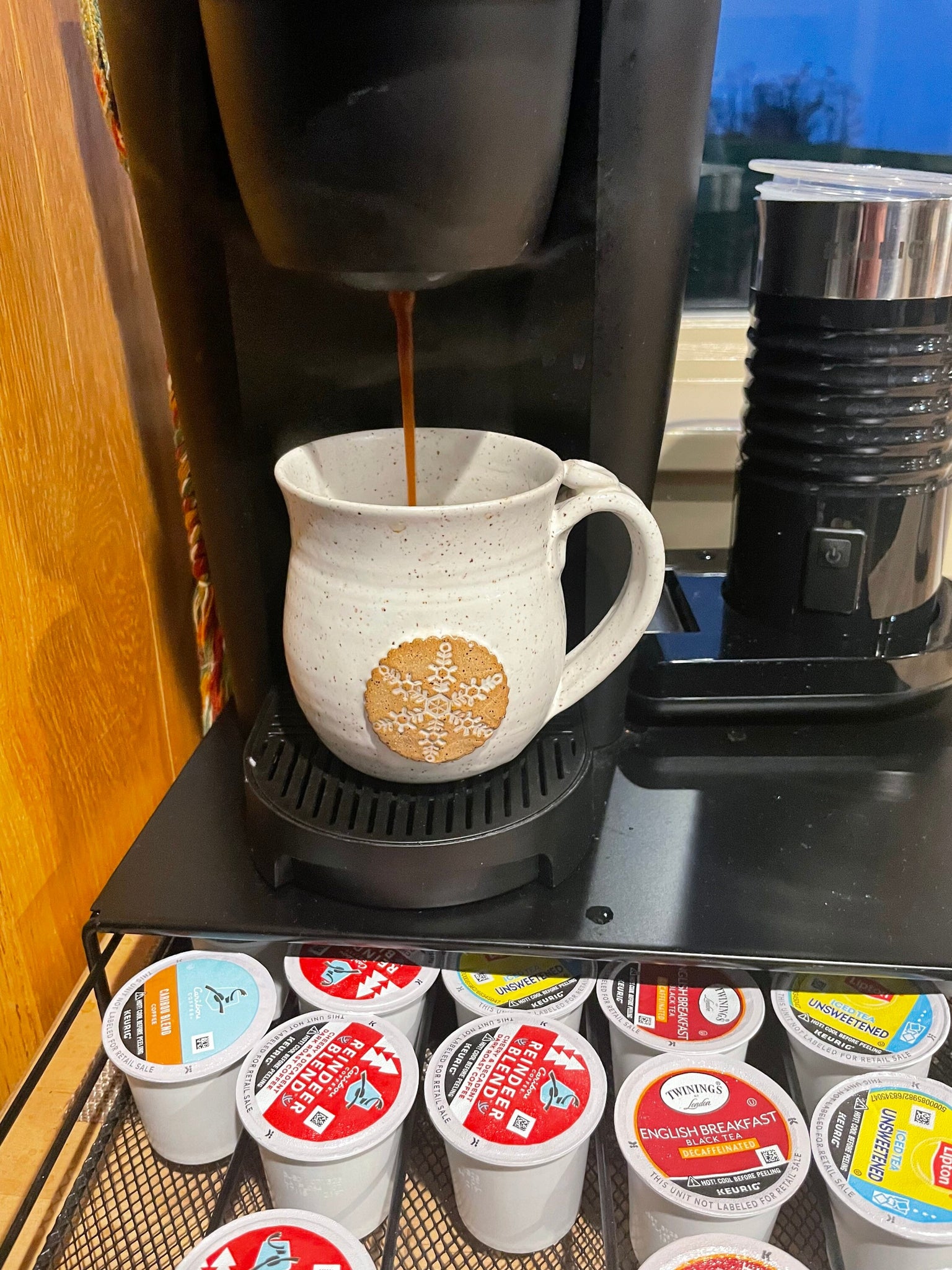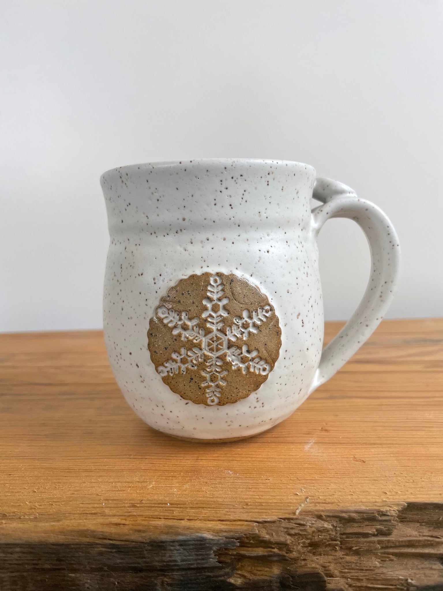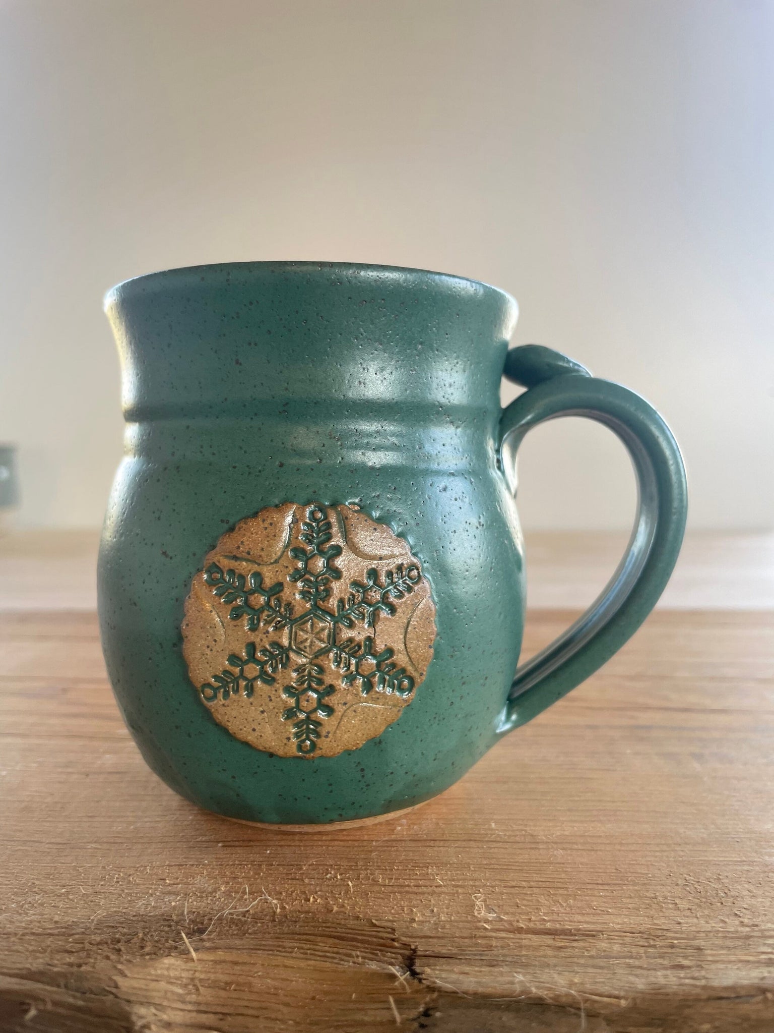 This listing is for one 10 ounce coffee/tea mug with a matte green OR matte white glaze. Holds just over 8 ounces with plenty of room for cream. This is a brand new glaze for me from the Coyote Clay company and it's the first time I've used a matte glaze. I just love the texture! Snowflake stamped on the front of each mug. Thumb rest. Food safe. Dishwasher safe.