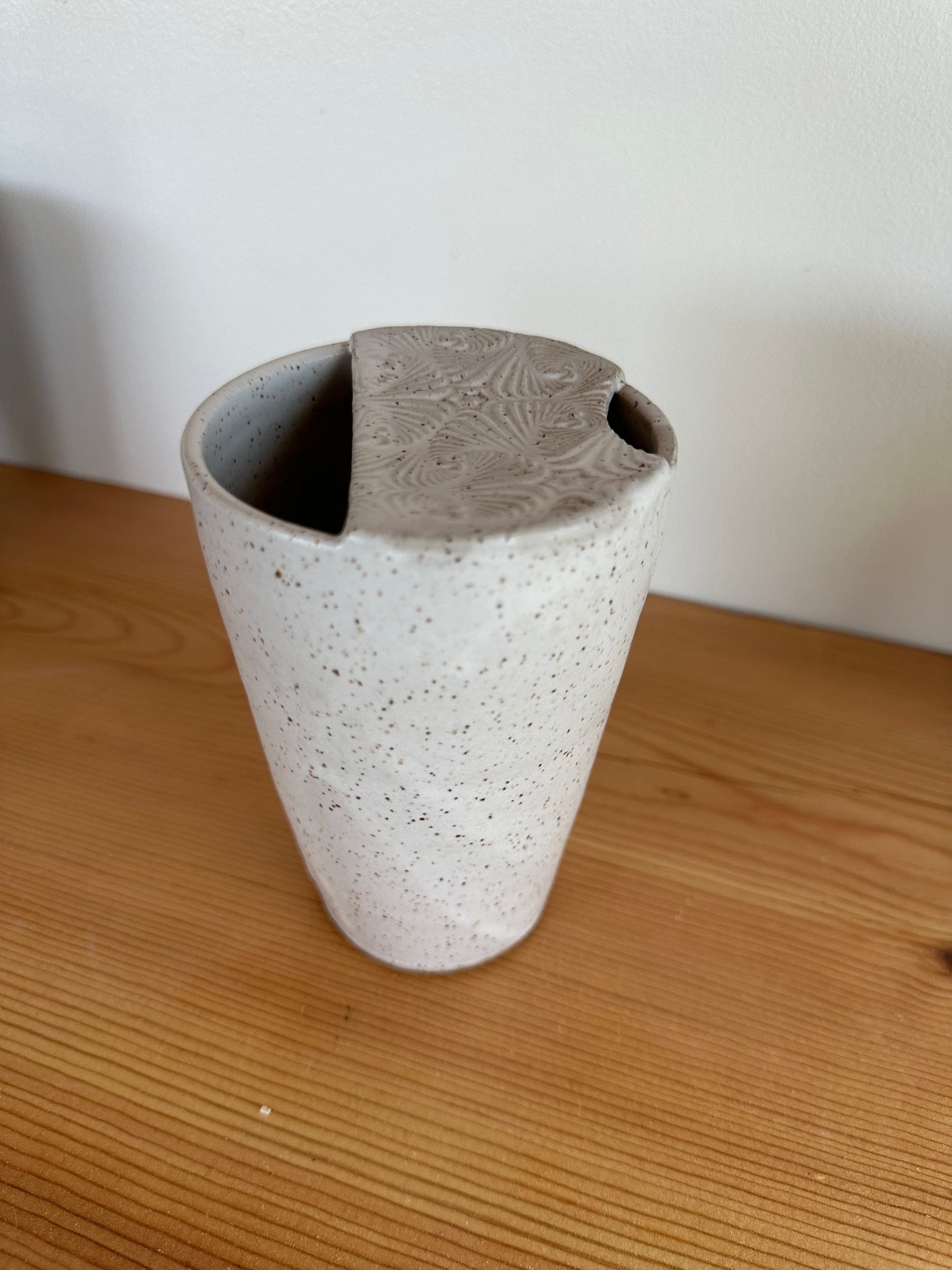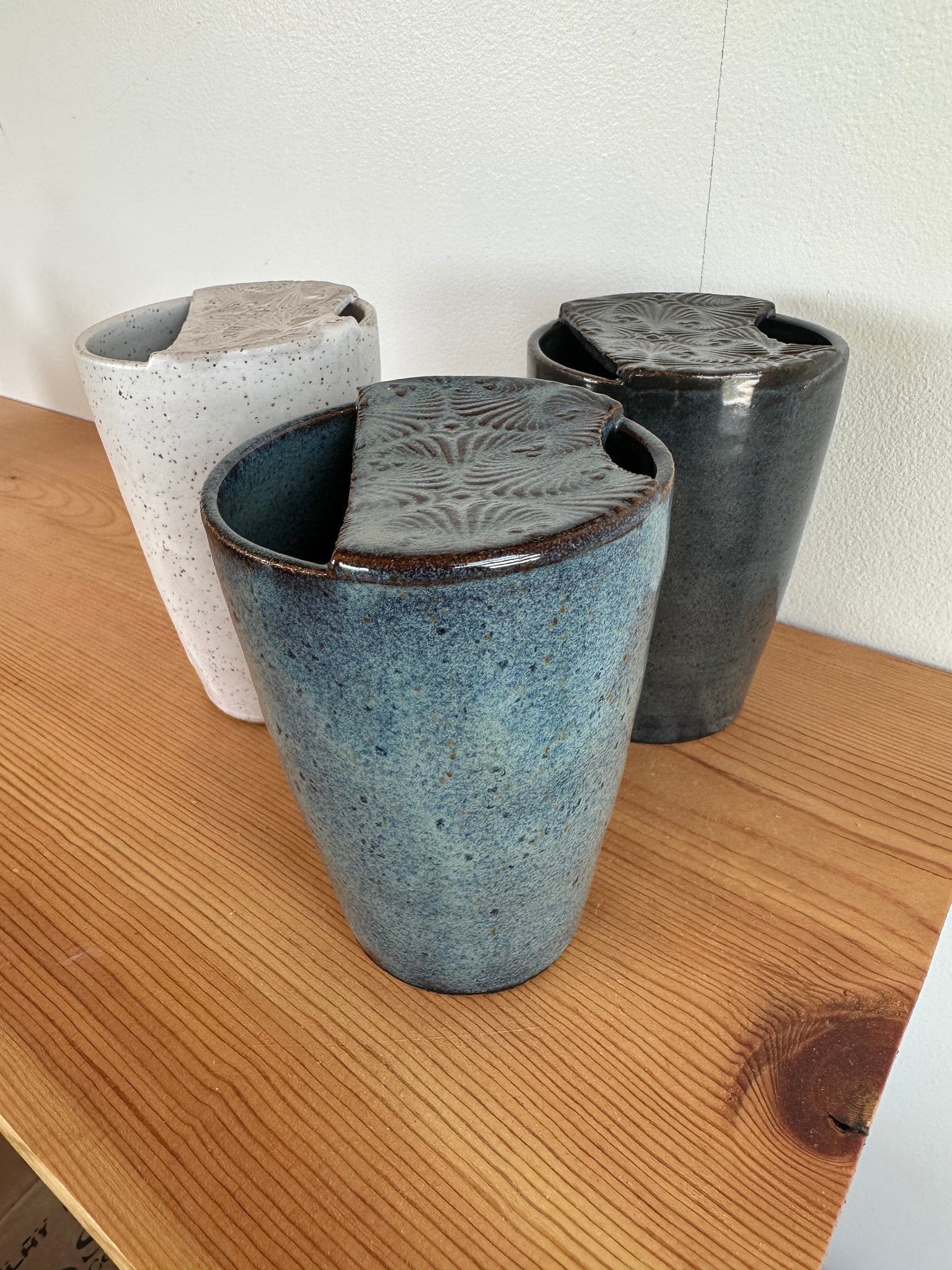 I'm calling this hand thrown travel mug "the Libby". It's as it should be... thanks for the inspiration Libby! If you're like me and you're trying to fit your favorite mug in your cup holder and end up with a disastrous mess every time, this is for you! (Yeti has nothing on me!) Available in three different glazes: blue, matte white or dark grey. Textured "lid". Dishwasher safe. Food safe.