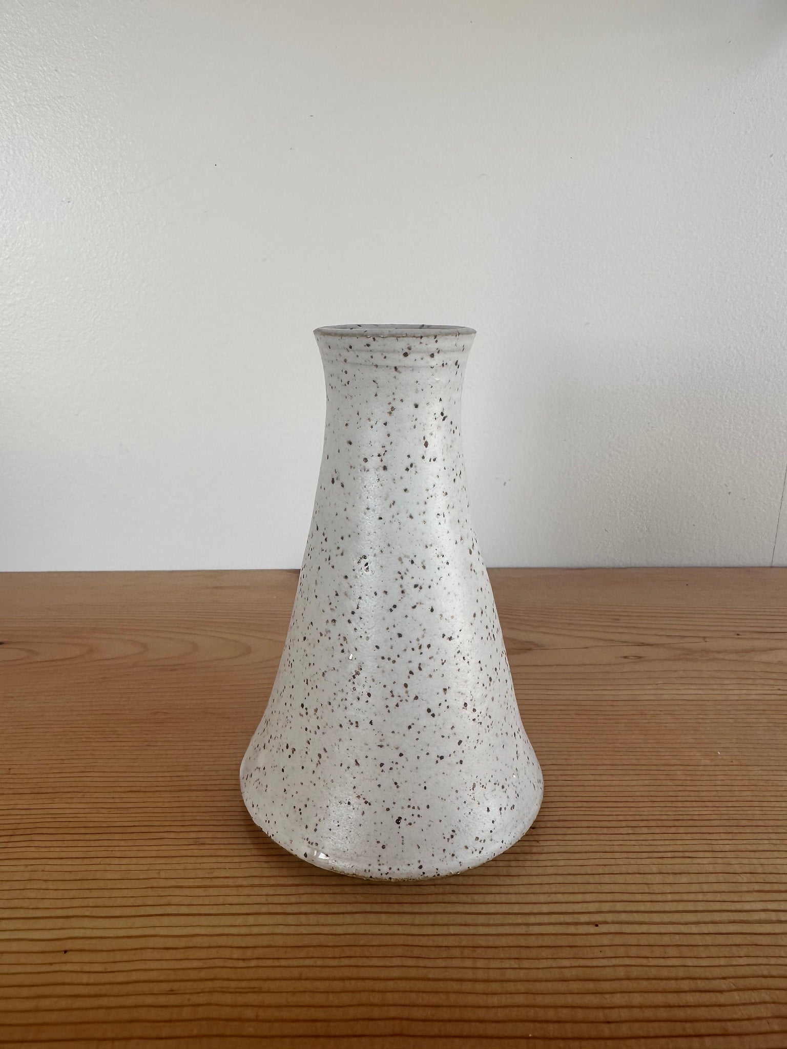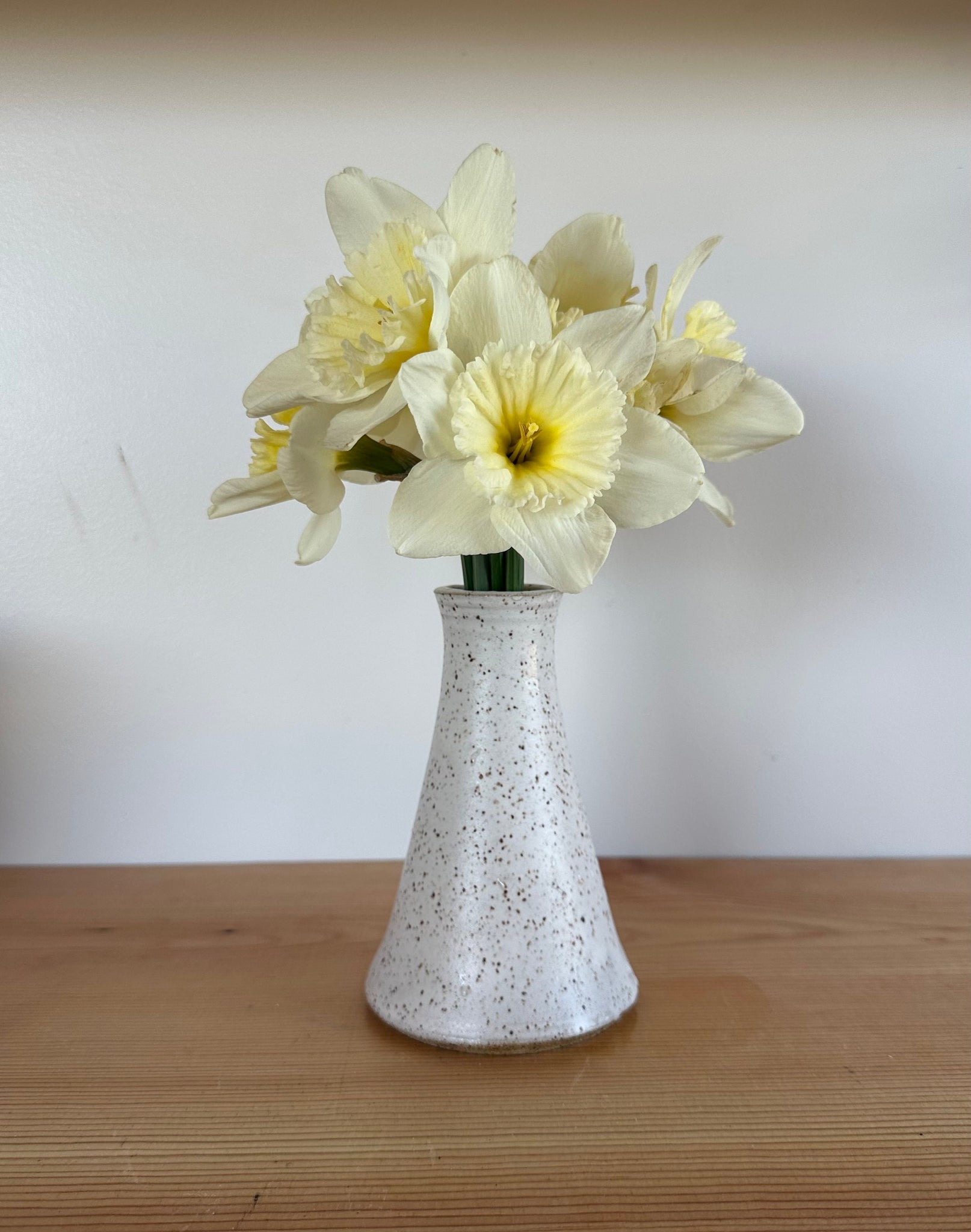 This elegant table top flower vase goes with almost everything! Matte white glaze on speckled clay. Looks good with all flowers!! Start with daffodils in the spring time and end with holly, sage, or rosemary during the holidays.